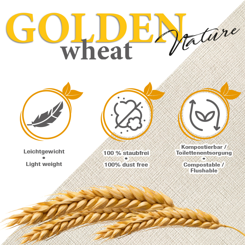 GOLDEN Nature ist die ideale, umweltfreundliche Katzenstreu für Katzenhalter mit hohen Ansprüchen. Sie nimmt Flüssigkeit schnell auf, bildet feste Klumpen und bindet Gerüche auf natürliche Weise. Die besondere Struktur der Pflanzenfasern sorgt für ein weiches und schonendes Hygieneerlebnis – sowohl für ausgewachsene Katzen als auch für Kitten.